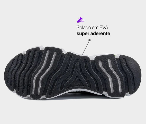 Solado de EVA que oferece amortecimento leve e suave. Material superior MESH, proporcionando conforto e frescor, adaptando-se ao formato do pé para uma ótima experiência durante o exercício.
